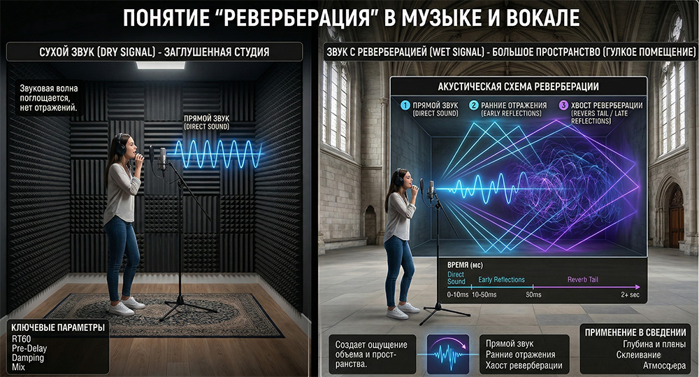 В звукорежиссуре эффект реверберации используется для того, чтобы поместить сухой (записанный в студии) звук в какое-либо виртуальное пространство и придать ему объем.